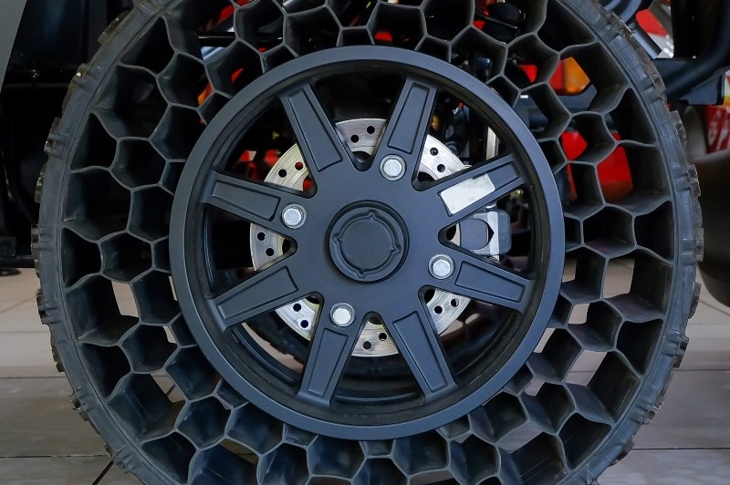 These tyres feature a complex internal architecture made from composite rubber and high-strength resin-embedded fibreglass that removes the need for compressed air to support the vehicle's weight.